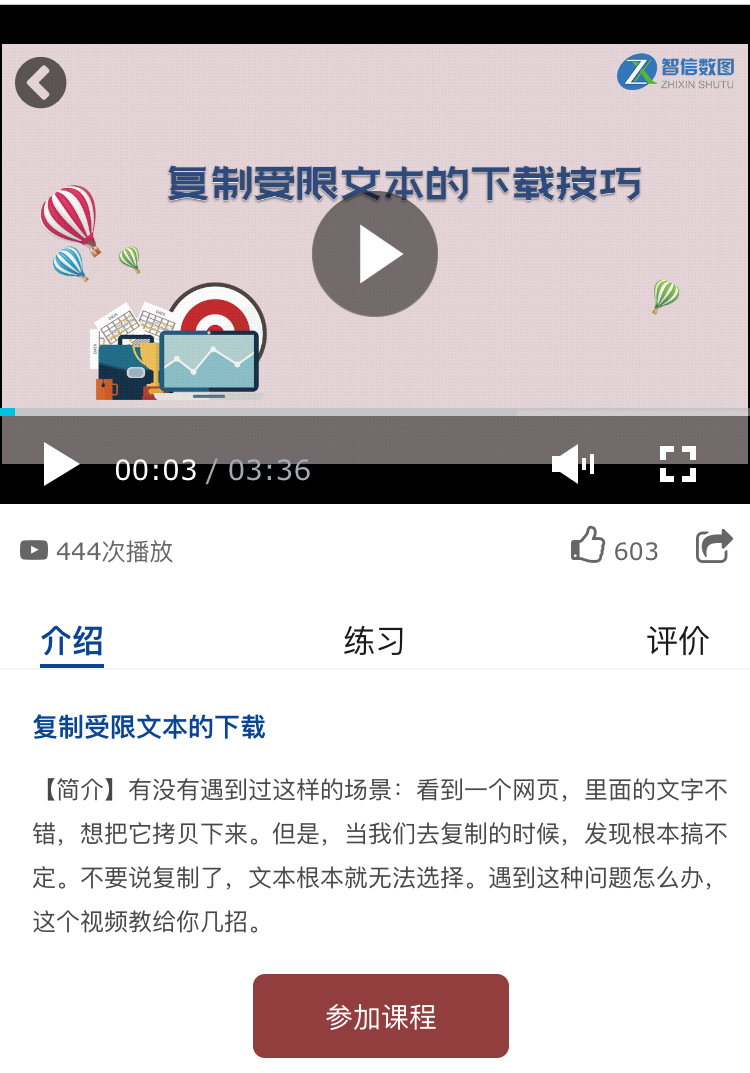 高校信息素养教育数据库辽宁省高校开放合作办学数字资源共建项目试用数据库之一,是高校师生学习信息检索、提高信息素养能力的专业视频数据库。数据库涵盖培训课程九章动画微视频通过2-5分钟讲述一个信息素养的知识点,课程短小精悍,干货满满,便于读者利用碎片化时间学习。数据库还包括练习题、专家讲座、PPT课件、特色专题等模块,全面聚焦信息素养教育资源。