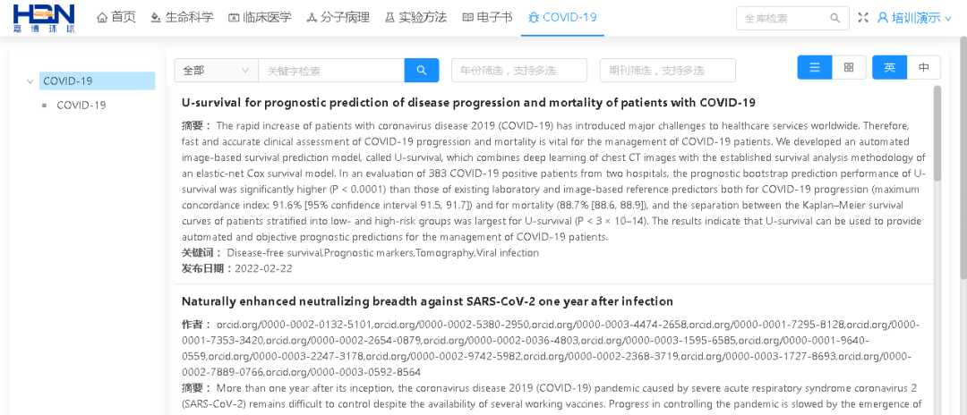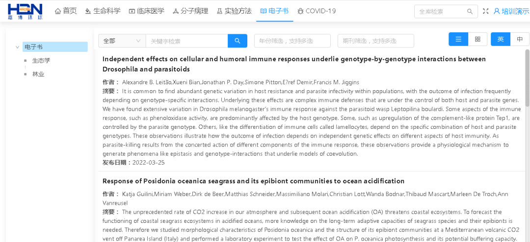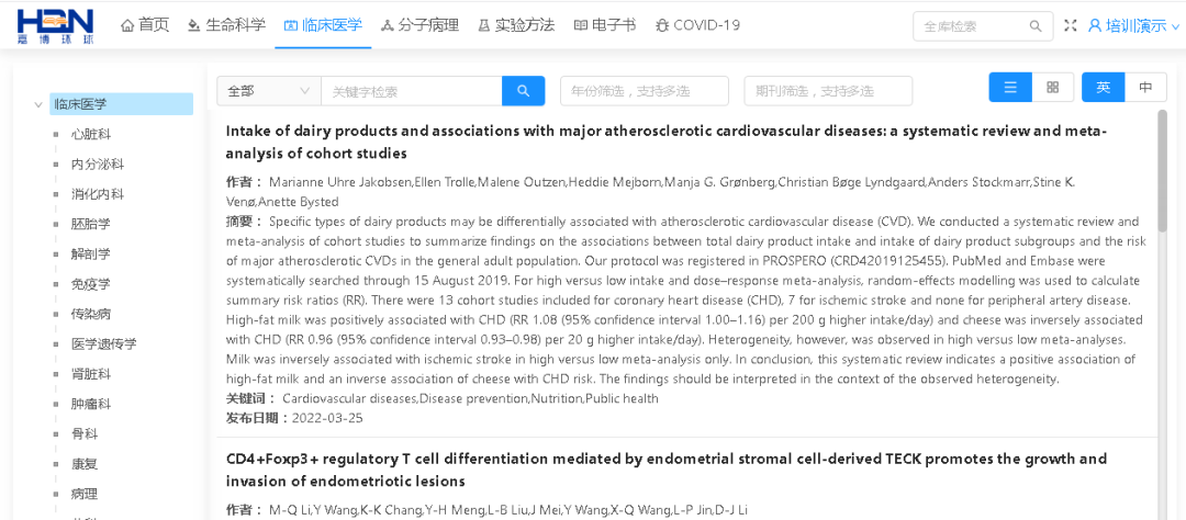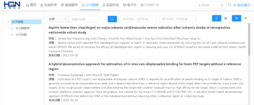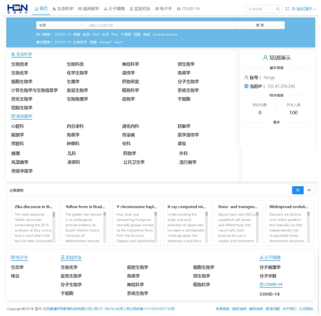 HBN全球生物医学数据库是由北京嘉博全球教育技术有限公司与世界知名期刊合作,精心打造的全球生物医学大数据文献平台,具有专业权威、内容全面、站位前沿、更新及时、同步翻译等优点。旨在将全球生命科学、医学、动物学、植物学、生态学、农林学、食品制药等领域的最新研究成果、科研方法、实验步骤、学术论文等实时推送到教育、科研、人才培养等实践中,帮助您及时了解全球相关学科的最新发展趋势,拓展国际视野,提高科研兴趣,定位研究方向,培养专业素质。嘉博产品已被清华大学、郑州大学、河南中医药大学、福州大学等全国数十所知名大学采用,希望并相信该数据库能帮助您学习、科研、毕业论文、课题设计等!