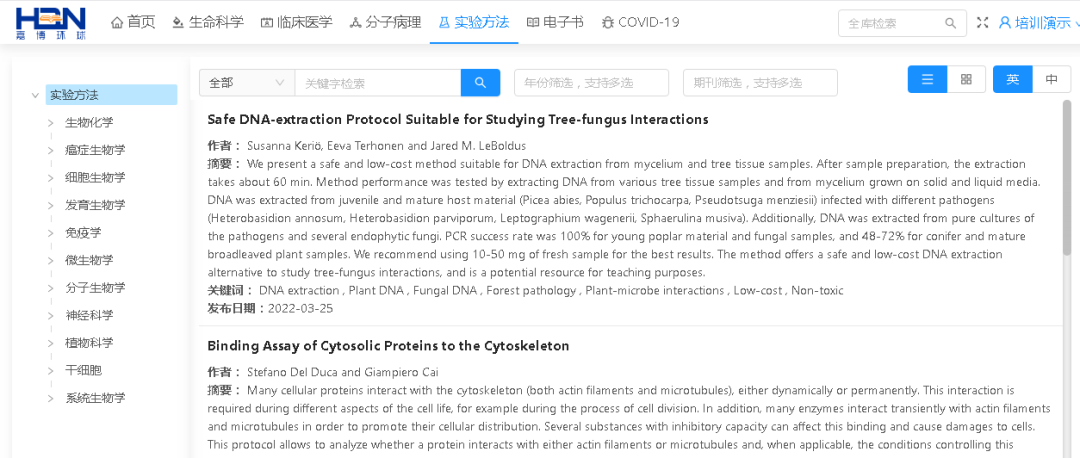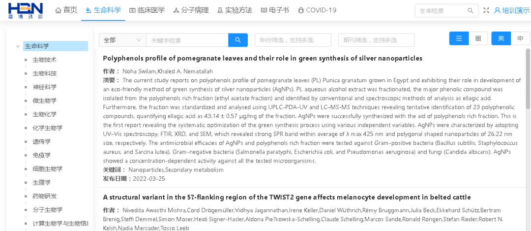 【收录数据】该平台涵盖生物学、动物学、医学、食品、制药、农林、环境、植物等近300个国际知名期刊,内容全面、前沿、实时更新、同步翻译;致力于最快、最方便、最准确的本地化需求,将最新信息、研究成果、科研方法推送到国内教育、科研、医疗、制药等领域。