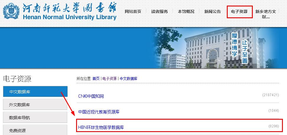 在校园网络环境下,登录河南师范大学图书馆首页,点击电子资源 中文资源 HBN环球生物医学数据库