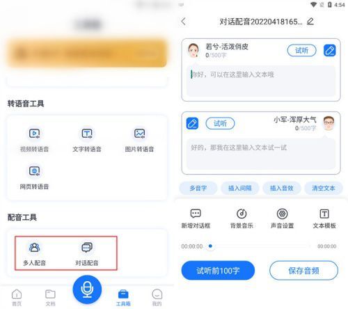 你认为这是一个录音工具吗!事实上,它不仅提供实时录音到文本,还提供视频声音到文本、多人配音、对话配音、语音翻译等功能,对话配音功能可以为文本设置不同的配音,还可以设置多音、背景音乐等,以满足真实配音的需要。