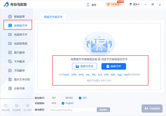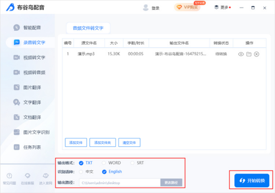 2.上传录音文件后,可以设置输出格式、识别语言、输出路径等。,最后点击开始转换。