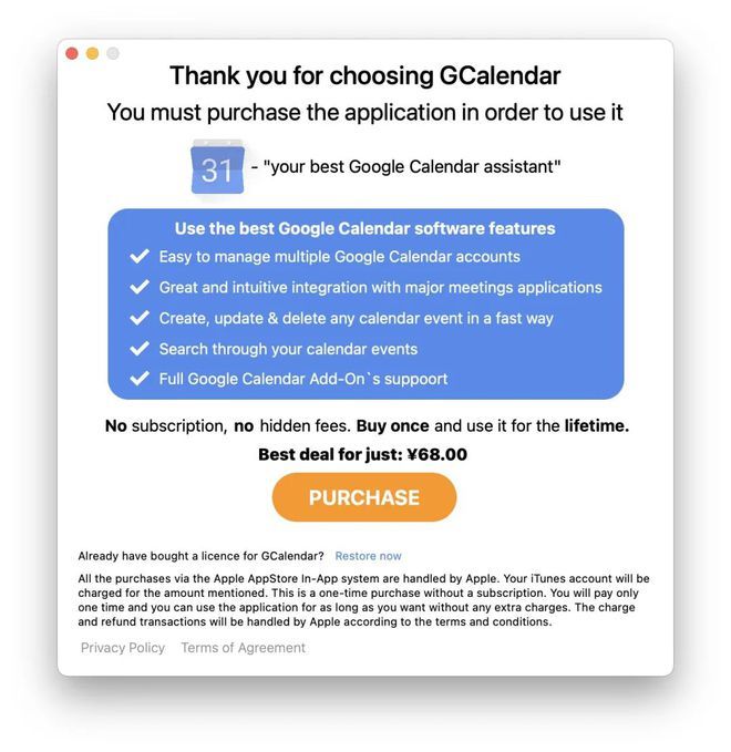 这种选择很正常,这种心理开发者也会注意到,于是出现了假内购模式,叫免费 内购,实际上是付费下载Mac App Store平台应用GCalendar for Google Calendar。