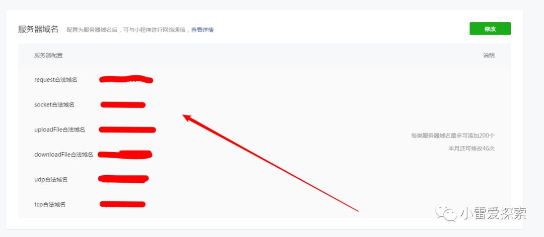 3、到小程序后台,将自己网站的域名添加到服务器域名中。基本配置已经完成。