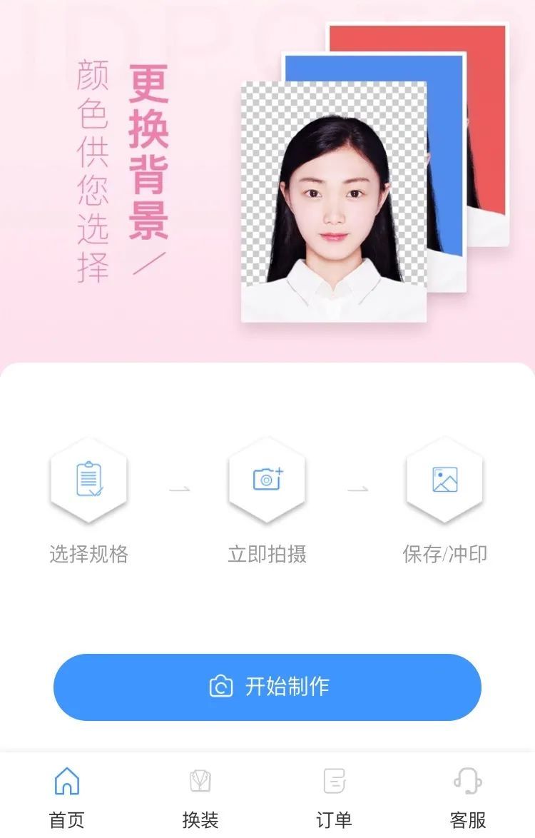 开始制作,选择照片规格和背景色,然后用手机拍照,自动生成标准的身份证照片!